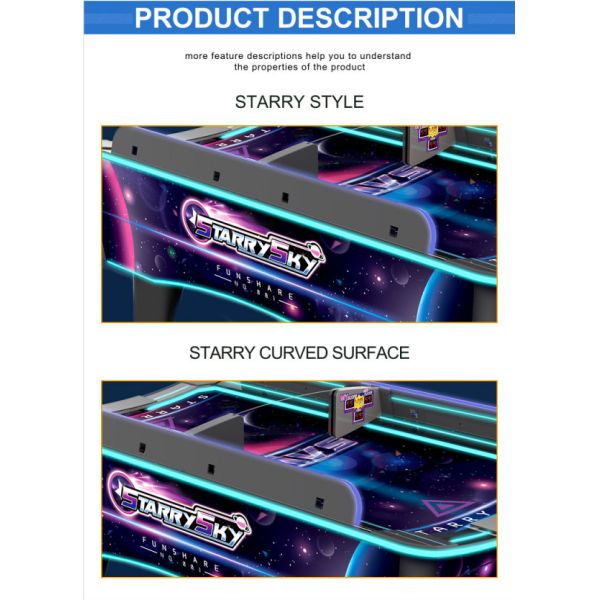After insert coins, start to play after 3 seconds. The hockey will drops from one hole. Players can shoot the hockey in the opposite's side hockey hole. Then score. The left side of the hockey table can show the current score and time. When finish the count down, game time end.