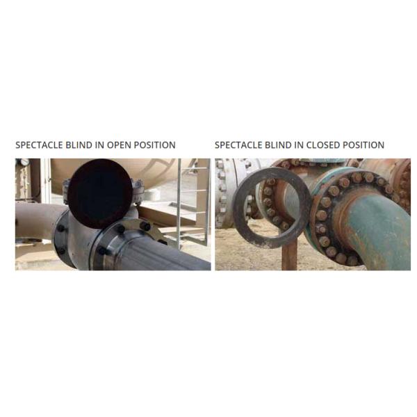 Spectacle Blinds be applied in systems, which regularly need to be separated from other installations. Normally, a Spectacle Blind is mounted in the "open" position so that flow through the pipe is possible. If the Spectacle Blind in the "close" position is rotated, the pipe is blanked off and no flow is possible.