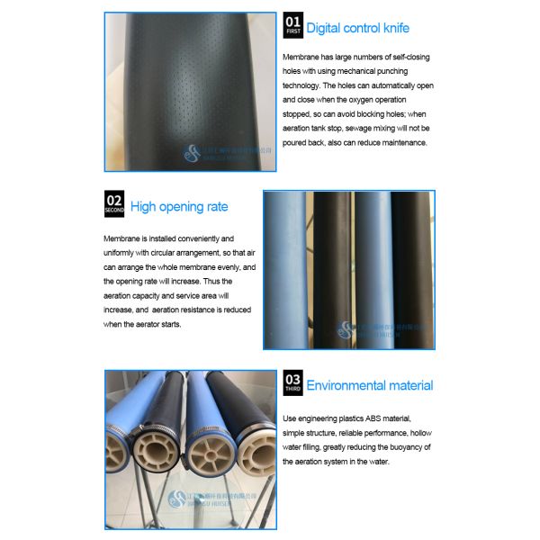 Rubber membrane adopts mechanical punching technology, opening a large number of self-closing holes. The holes can automatically open and close, to avoid blocking holes when the oxygen operation stopped; when the aeration tank stops operation, sewage mixing will not be poured back, reducing maintenance.