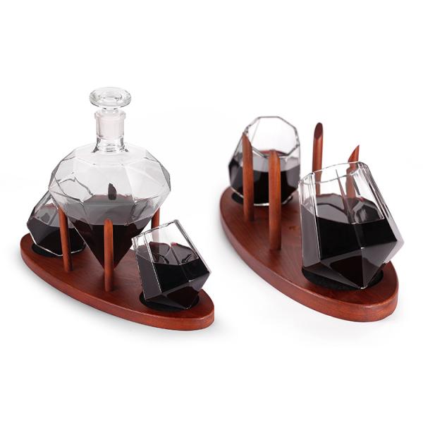 Great as a starter of finishing touch for any bar. This is a hand crafted carefully constructed DIAMOND decanter with diamond glasses, will make anyone admire the artfully detailed diamond shape spirits decanter, and it's symmetrical mahogany base.