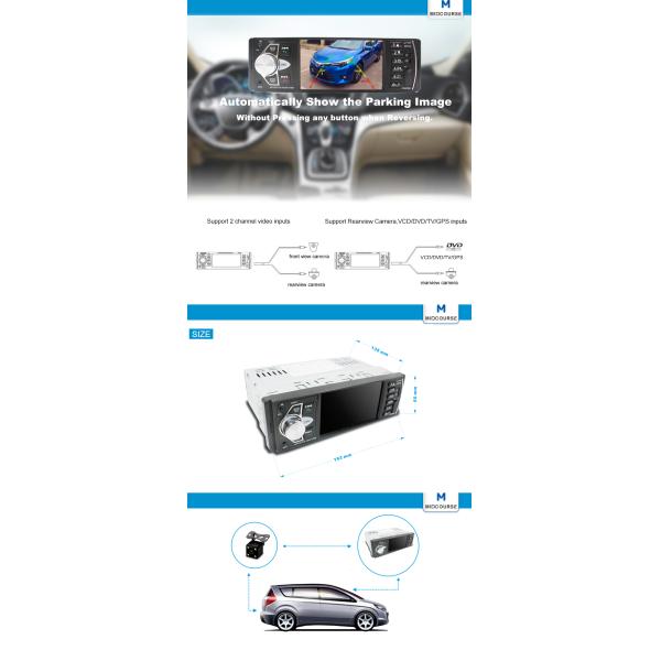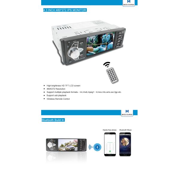 Package Contents | 1 x MC4224F 4.3 inch Bluetooth V2.0 Car Stereo MP5 Player, 1 x Remote Control, 2 x Power Cable, 1 x English User Manual , 1x backup camera | ||