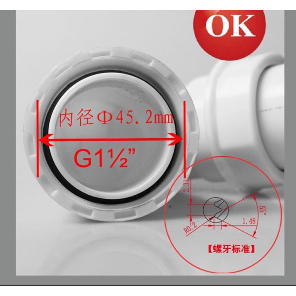 Basin drainage system, curved down pipe, size: drainage pipe φ40mm, screw thread: G1 1 / 2 'standard pipe screw thread, material: PP + PVC.