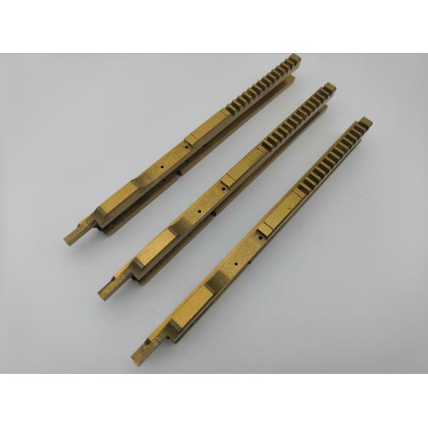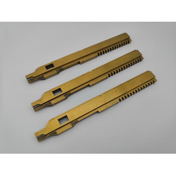 The surface of this high speed steel product is processed by precision grinding machine, square groove and tooth shape are processed by slow moving wire equipment.The parts are contact cutting consumable parts.To improve the life of the part, this part is made of Hitachi skh-9 material, and is treated by vacuum heat treatment and ultra-cryogenic process.The surface of the parts is plated with yellow titanium to improve wear resistance and ornamental value.The size of the product shall be ±0.005mm, and the light junction shall be above RA0.8. At the same time, the special-shaped surface shall be cut thick, and then refined grinding shall be carried out.