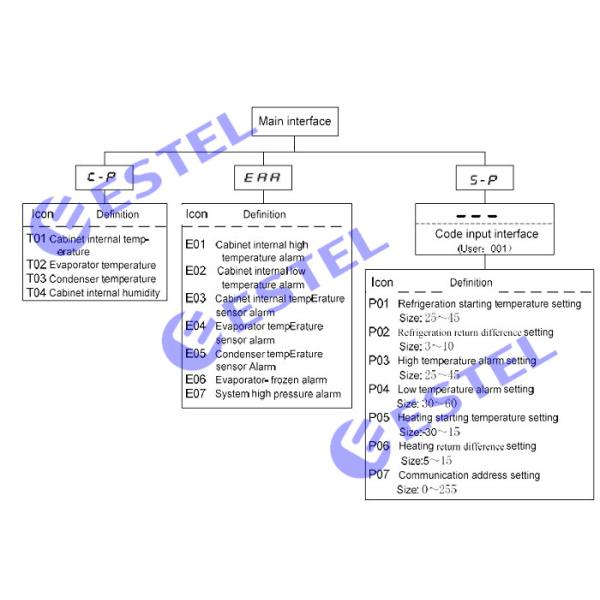 Under running, the main interface displays real temperature value in cabinet.After boot, in any interface, if there has no keyboard operation in the continuous 60s,automatically return to the main interface.