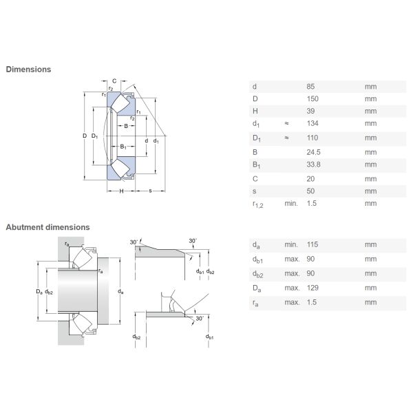 | Designation | Principal dimensions | Basic load ratings | Fatigue load limit | Speed ratings | Mass | ||||
