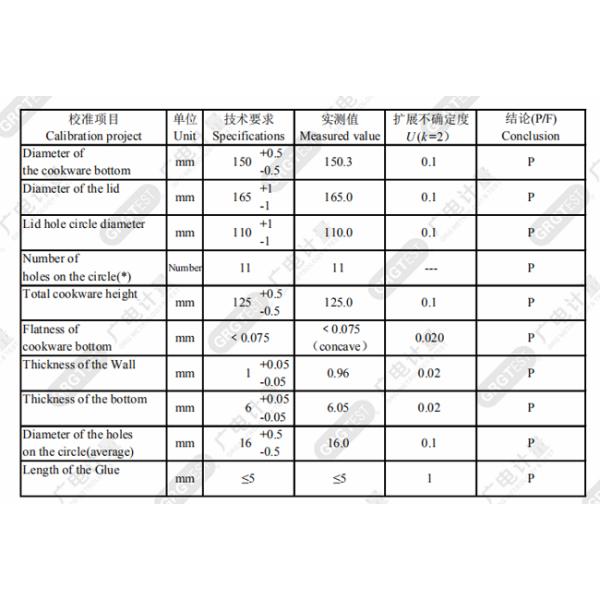 The vessels are designed according to EN60350-2:2013 figure Z1, the side wall of the vessel is made of 1.4301 stainless steel with thickness 1mm±0.05mm, the bottom of the vessel is made of 1.4016 stainless steel with thickness 6mm±0.05mm, the cookware is cylindrical withour handle or protrusions. And the lid is made of aluminum, and thickness is 2mm±0.05mm, each hole circle of the lid has a diameter of 16mm±0.1mm, the holes shall be evenly distributed on the hole circle. The lid is flat and can accommodate a temperature sensor in the center.