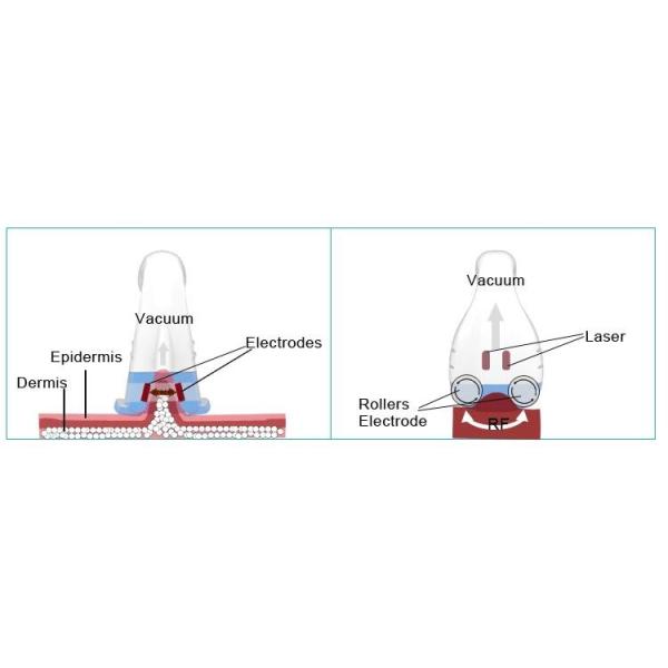 1) Vacuum plus specially designed rollers manipulate leads RF penetration to be even 5-15mm. Nip and stretch fibrillar connective tissue greatly improves body contouring effect.