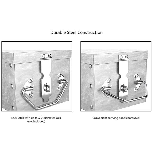 Safely store your expensive tools, cash, knives or other valuables in this 12 inch metal storage lock box. This sturdy metal construction lock box is easily stackable and has a convenient fold down carrying handle and a lock hasp (lock not included) for added security.