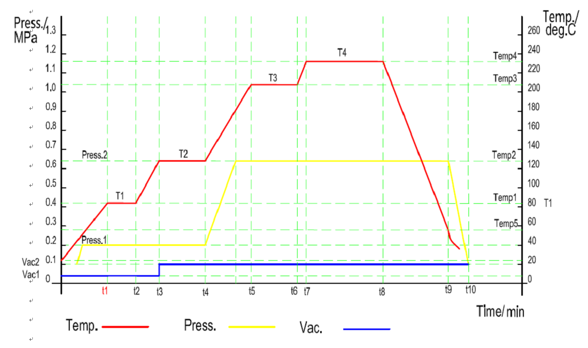 (1) Put the blank of composite materials and the moulds into the vacuum bag, and then put into the autoclave together, finally, start to vacuum, getting the vacuum to the set point: Vacu1