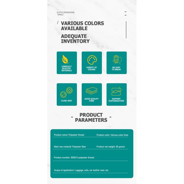 Polyester yarn is smooth, firm, not easy to break, strong toughness, good tension, compact structure, no needle skipping, not easy to pile, no color difference and not easy to fade.