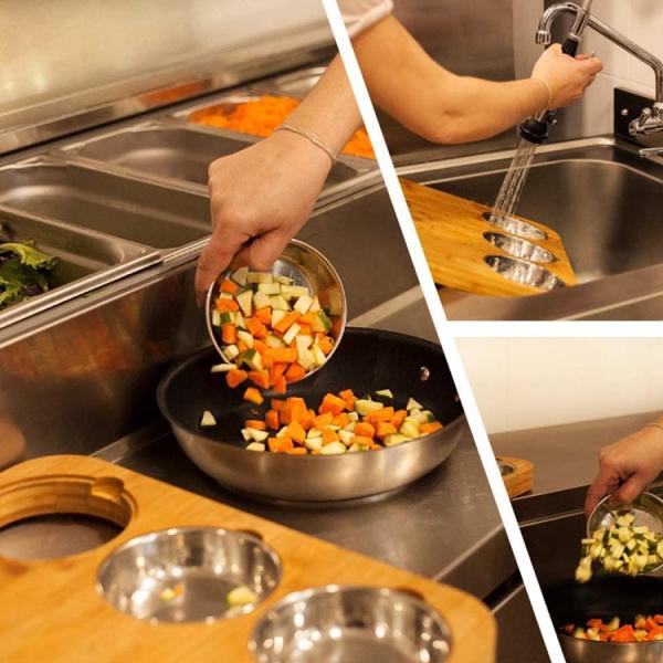 · INTEGRATED STAINLESS STEEL BOWLS: Unlike other Cutting Boards for Kitchen, proudly display in the kitchen . Follow recipes better; organize and segregate foods to until cooking for that fresh cut taste. Transfer to the pan from the attached bowl or store for use later. Legs and non-slip grips make it safer.