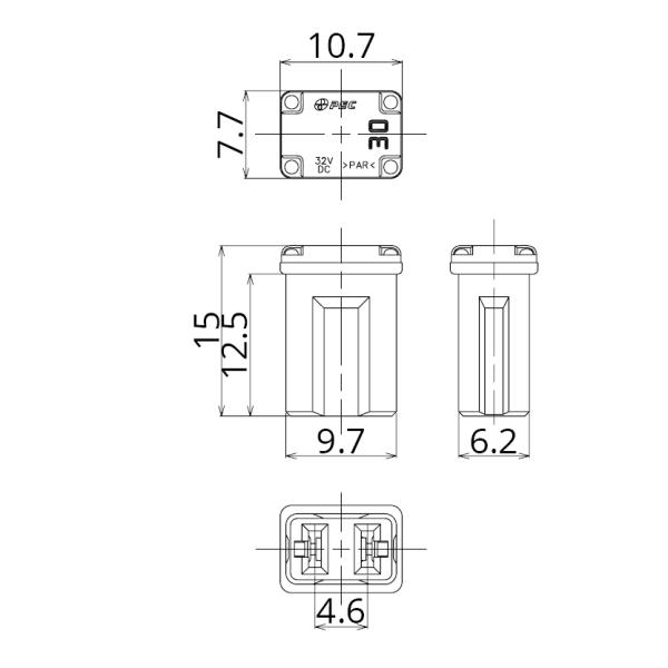 Drawing of SBFC-M fuse PEC SBF Slow Blow Fuse 15A 20A 25A 30A 40A