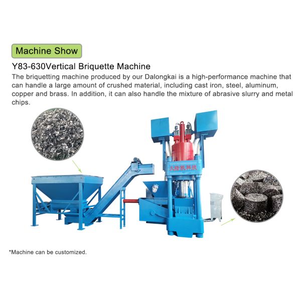 The briquetting machine produced by our Dalongkai is a high-performance machine that can handle a large amount of crushed material, including cast iron, steel, aluminum, copper and brass. In addition, it can also handle the mixture of abrasive slurry and metal chips.