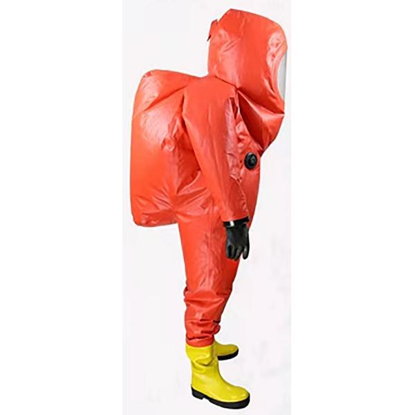 The suit includes an airtight one-piece suit covering the entire body, a supplied air respirator rucksack, a large transparent visor, an air-tight zipper, one-piece chemical resistant shoes, changeable gloves and a vent valve . When used with a supplied-air respirator, airflow enters the mask through the supply valve. Exhaled air is discharged into the chemical protective suit through the exhalation valve of the mask, causing a slight overpressure in the chemical protective suit. The gas is discharged from the chemical protective suit through the overpressure exhaust valve on the protective suit. There is enough space inside the hood for the wearer to wear the safety helmet and to freely turn the head to read the compressed air pressure gauge. The wide sleeves also allow the user's hands to be freed from the gloves and sleeves, allowing them to move freely within the suit.