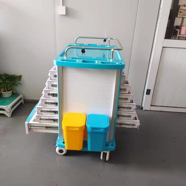 This medicine delivery cart is suitable for medical staff to give first aid to patients; it is mainly composed of aluminum, steel, and ABS engineering plastic structure, with four-column load-bearing; ABS double-layer bottom surface injection molding process table top, concave design to prevent items from slipping, 304 stainless steel three sides surround, table top The top is equipped with transparent soft glass; two ABS dirt buckets are convenient for sorting and storing garbage; there is a central control lock on the front, and a five-layer medicine tray. There are partitions inside, which are divided into 25 people in the morning, middle and evening. There are 3X3 partitions in a large drawer. , can be separated freely; it is convenient to store all kinds of medicines and equipment. Luxurious silent casters, two of which have brakes, can use the brake function in any state, are sturdy and durable, and can be pushed and turned arbitrarily on flat ground;