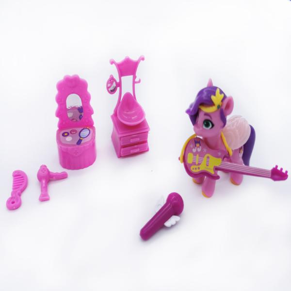 My Little Pony is popular with the public. This toy in the shape of a singing Pony. The whole set of toys contains Pony, comb, hairdryer, dresser, shuffleboard, microphone and guitar.