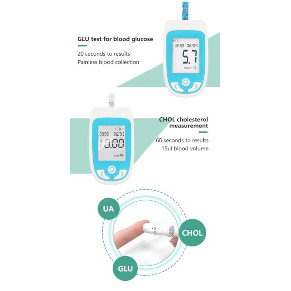 This product is applied to monitor the concentration of blood glucose uric acid cholesterol in peripheral whole blood or venous whole blood of human body in vitro. This product is only used for daily self-monitoring. The test results cannot be considered as the basis of clinical diagnosis screening and medication guidance.