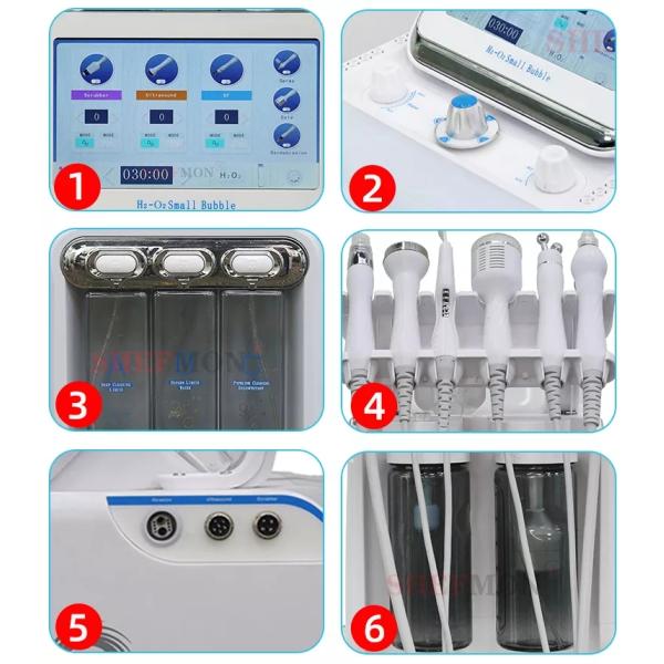 1. Bi-pole RF: penetrating the barrier of epidermal basal melanophore, heating the dermal collagen fibers to 55℃-65℃ to accelerate contraction. 2. Ultrasonic: activating cells, accelerating metabolism and promoting cell permeability thus helping lead in and absorb skin care product and achieve skin beauty. 3. Vibration: stimulating and relaxing skin, cleaning, removing dead skin and blackhead. 4. H2 / O2 spray: producing oxyhydrogen combined with essence, quickly penetrating dermis through high pressure injection to provide nutrients thus reduce wrinkles, whiten, brighten and rejuvenate skin. 5. Water dermabrasion + vacuum cleaning: cleansing, exfoliation, extraction, hydration and antioxidant protection simultaneously, combining vacuum to suck out dirt. 6. Cold hammer: shrinking pores, enhancing collagen fiber, constricting blood vessels to tighten and soothe skin, maintain elasticity, reduce wrinkles and redness.
