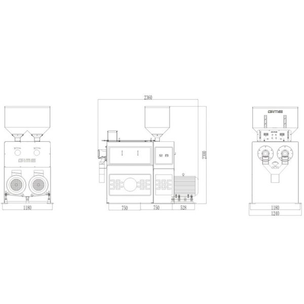 Model | Output (Tandem) (t/h) | Output (Parallel) (t/h) | Spindle speed (r.p.m) | Main equipment power (Grade4) | Blower power (Grade2) | Weight (kg) |
