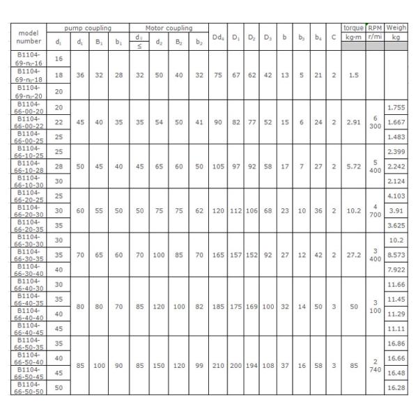 Claw type coupling is a kind of water pump coupling, in which the sliding block made of laminated bakerwood or polyurethane, light weight, simple structure, easy installation, low price, often used in small power occasions, suitable for torque is not large, high speed, no sharp impact of the two shaft connection.Nylon sliders transfer torque is small, but more suitable for high-speed operation, and do not require lubrication, pump industry standard code is Bl104.