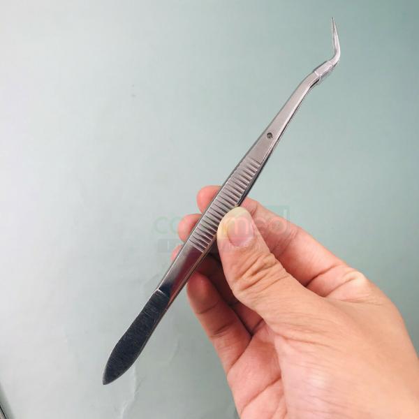 The tweezers are made of stainless steel and can withstand high temperature and high pressure disinfection. Shape is a common elbow design in the industry, which is convenient for clamping objects. During the production process, we polished the surface of tweezers to ensure that the surface of each tweezer is smooth and free of particle feeling. In the middle of the tweezers, we adopt anti-skid design to prevent the tweezers from falling off during operation.