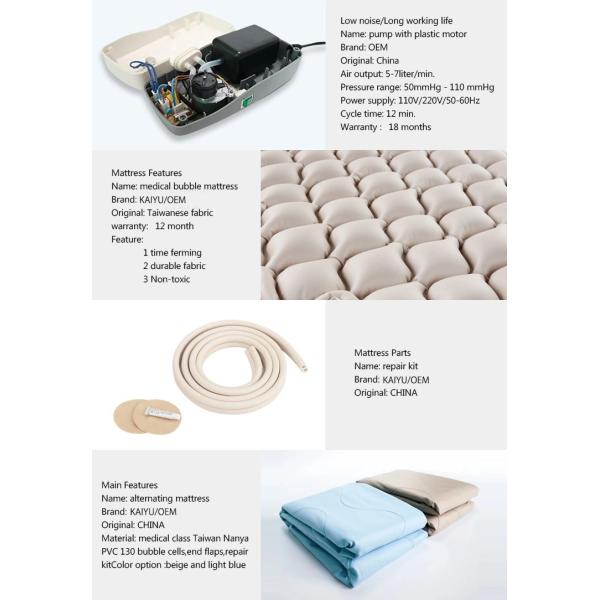 Our medical anti-decubitus mattress made of Taiwan Nanya / Dingzing(PVC/ TPU, One-time moulding for bubble type mattress. Offer a variety of woundcare solutions for the treatment and healing of pressure ulcers. Give mattress warranty 12 months and compressor 18 months. Top quality compressor provide very silent and durable, big air output advantage.