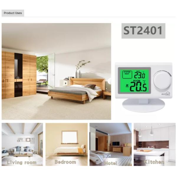 ST2401 is a digital room thermostat with a LCD display. You can control room temperature by turning on/off electric heaters in heating, cooling applications.