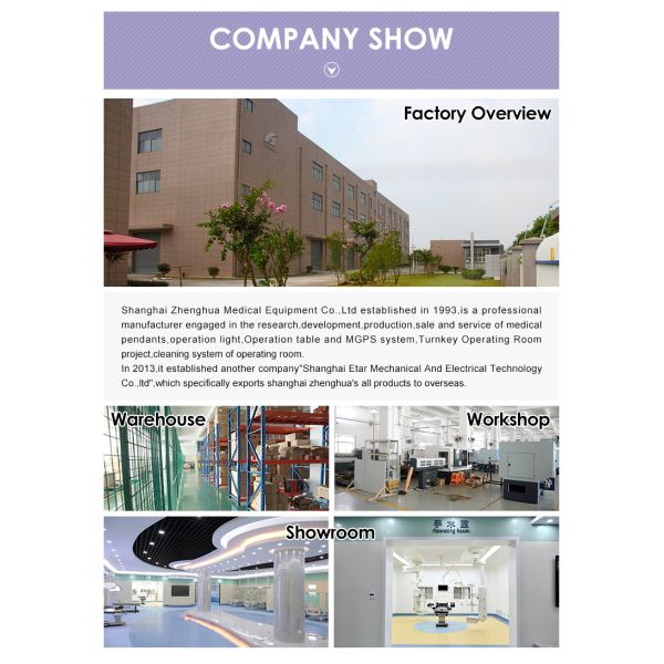 Shanghai Zhenghua Medical Equipment Co.,Ltd established in 1993, is a professional manufacturer engaged in the research, development, production, sale and service of Medical Pendants, Operation Light, Operation Table and MGPS system, Turnkey Operating Room Project, Cleaning System of Operating room. In 2013, it established another company "Shanghai Etar Mechanical And Electrical Technology Co.,Ltd", which specifically exports Shanghai Zhenghua's all products to overseas.