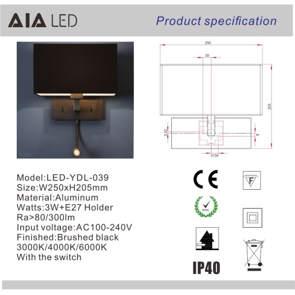 | Relevant Certificate | CE, RoHS,EMC for 3W led wall light/led reading light |