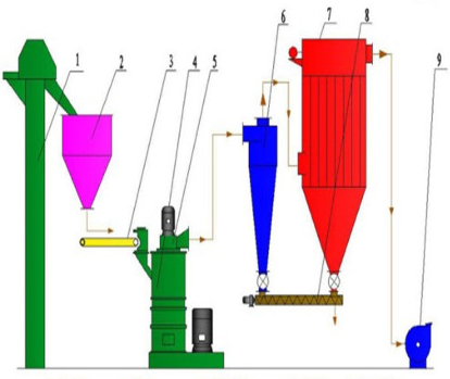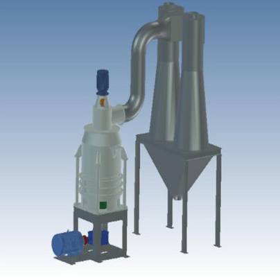 The eddy current generated by the rotating turbine in the powder separator makes the coarse granular materials fall back and reground. The fine powder enters the cyclone powder collector with the airflow and is discharged from the discharge valve at the bottom of the cyclone powder collector, which is the finished product. The airflow with a small amount of fine dust is purified by the pulse dust collector and discharged through the fan and muffler.