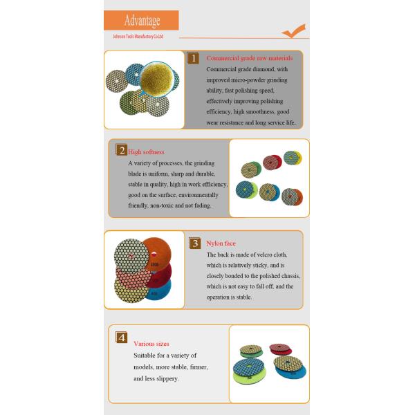 | Features: | 1. Top quality dry polishing pads, Super flexible very aggressive. 2. Fast speed, save polishing time.Incredible polish performance. 3. Dry Polihsing Use |