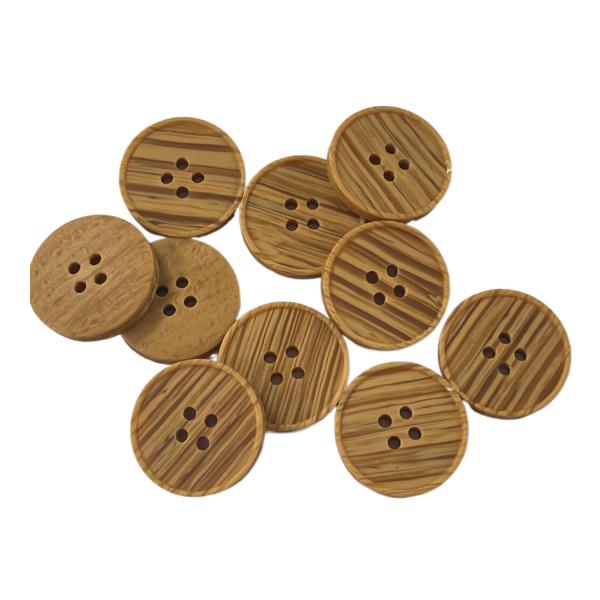Polyester Imitation wooden Buttons, made by Eco-friendly resin material. Resin buttons are very durable and harder. Price is cheaper than natural wood buttons. Wood effect with four hole, glossy, smooth, no rough edges, the interior edges of 4-holes are buffed. All these properties make our buttons exceptional. This type of sewing buttons is most commonly used on women's coat, but can also be sewn onto garment accessories. Fake horn buttons are so versatile that they look good on any garment you put them on.