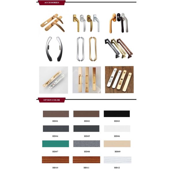 Profile | 1.High quality aluminum alloy profiles, thickness 1.2-2.0mm2.Excellent quality thermal break aluminum profiles, thickness 1.4-3.0mm3.PVC/UPVC material (need to be ordered) |