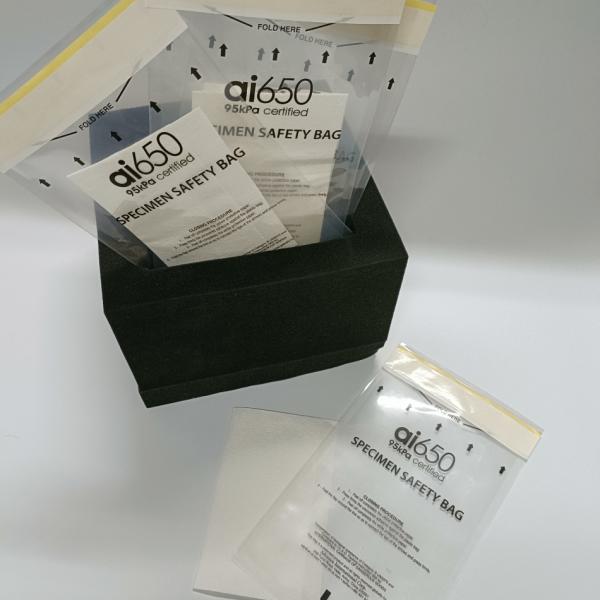 This is a transparent packaging bag for laboratory sample transportation, mainly for the safe transportation of laboratory samples. This is a four-slot sample bag, and each compartment can hold a tube with a diameter of 25mm , The separated packaging can also effectively isolate and avoid the mutual influence between the test tube samples. Under normal atmospheric pressure, this sample bag will never be damaged if it is not affected by human factors. On the back of the test tube separation bag is a whole piece of absorbent paper, which can quickly absorb the leaked sample solution, and can also be quickly inactivated to prevent the spread of contamination. Our complete package includes a carton outer packaging, a foam carton. ice packs, etc. If you have specific customization requirements for the outer packaging of the carton, you can contact us and we can introduce our customization services to you.