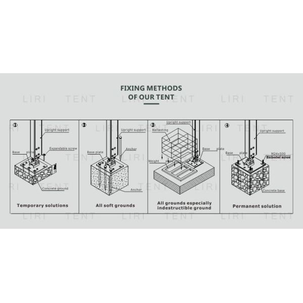 The material used for the frame of the semi-elliptical geodesic dome tent is basically made of high-strength steel pipes that can withstand strong winds of 8-10 levels, and the tarpaulin is made of PVC fabric. In addition, we have translucent PVC, transparent PVC, various color PVC, PVC fabric printing, etc. It can be customized according to customer needs, which makes the semi-elliptical geodesic dome tent more individual. In addition, the Liri tent comes with accessories such as lighting, mats, air conditioners, tables and chairs to create a more comfortable environment for your event!