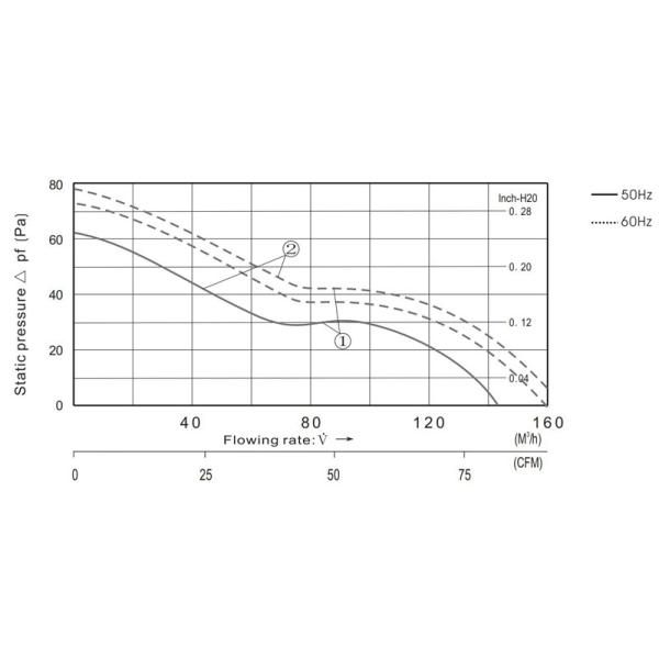 | V | Hz | (A) | (W)+10%-20% | (min-1) | CFM | m3/h | (Pa) | (dB) | (μF) | |||