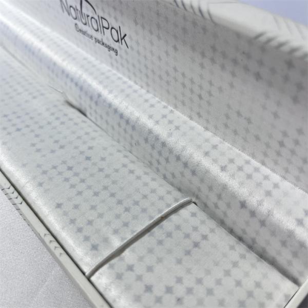 The box outside is covered with Gorgeous white background/colorful print soft touch paper from top to bottom,Side is with white soft touch paper,inside of the box, satin with misterious colorful print top liner/hinge/insert perfectly match to top Logo: foiled on inner top packing: normal white sleeve
