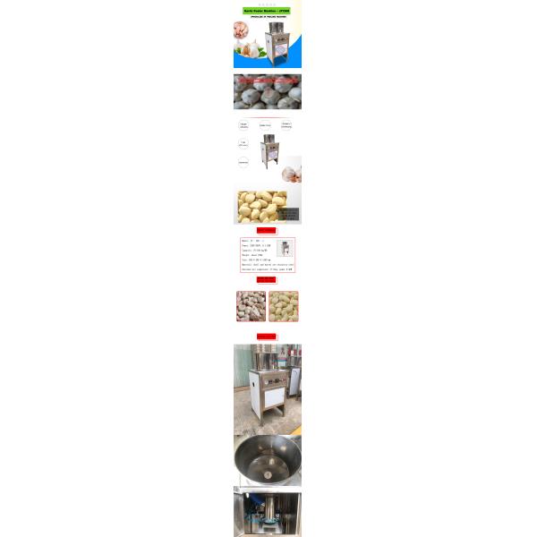 Function : Its working principle is to compress air as power producer , then form strong swirl air flow to peel the skin of garlic smoothly with low damage rate . It should be equipped with an air compressor. This machine consist of dry part and peeling part. It is suitable for garlic processing factory, food factory etc.