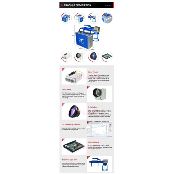 Portable fiber laser marking machine is also known as hand-held fiber laser marking machine. It is designed to solve the problem of laser marking of existing large parts. The size of the whole machine and the main computer box is small and convenient, which can be hand-held for operation, and can be used for laser marking of large mechanical parts in any direction.