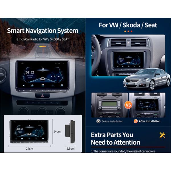 | This Android head unit for VW Passat Tiguan Go with 1024*600 high resolution full touch screen, 2.5D tempered glass mirror, high contrast, clear, bright. It can effortlessly be switching through settings with your finger. |