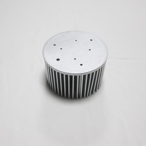 This cold forged heat sink is based aluminum 1070 material to processing, first of all, we check the raw material dimension is fine or not, the second is that according to the drawing, use Hydraulic press machine to do the roughcast, the third is that accroding to the drawing, use the wood machine to cut the outline dimension, the forth is that use the CNC to do exact dimension, the fifth is do anodizing clear, the last step is riveting, and then inspection/packing. First inspection and patrol inspection are done in processing.