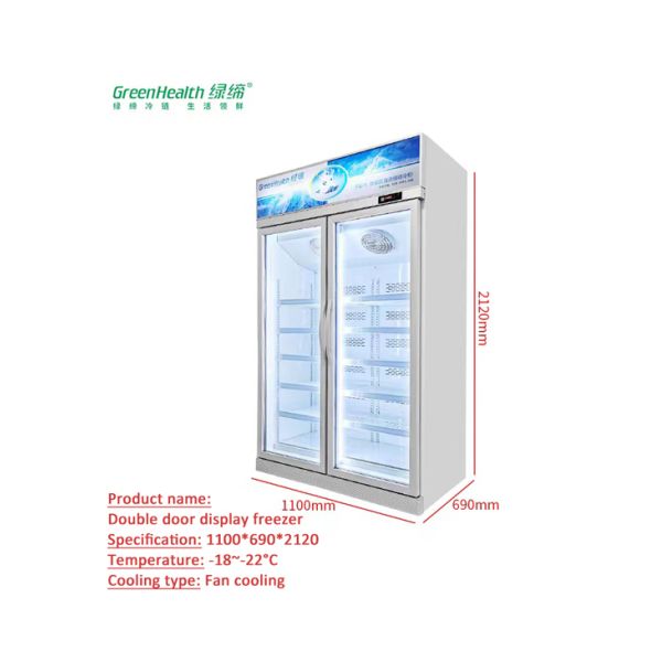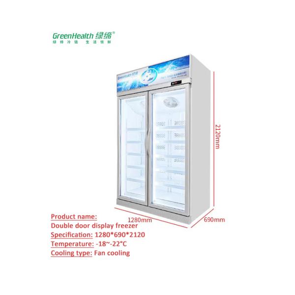 This commercial freezer by Guangdong Green&health Intelligence Cold Chain Technology Co.,ltd has a sleek, modern design that will complement any store's decor. It features rapid and deep freezing capabilities, energy saving features, high brightness LED lighting, and a self-rebounding door. The glass door is equipped with a heater to prevent condensation, and the unit has fan cooling with self-defrost capabilities. An intelligence controller allows for easy operation, and the unit comes with five adjustable shelves. It uses a Danfoss compressor with R290/R404a refrigerant.