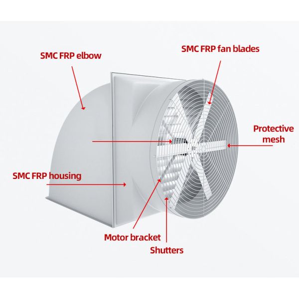 The FRP big size exhaust fan's blades are made of FRP (fiber reinforced plastic), a material that is known for its resistance to corrosion and rust. This makes the fan blades durable and long-lasting, even in environments where they may be exposed to corrosive or rust-causing substances.
