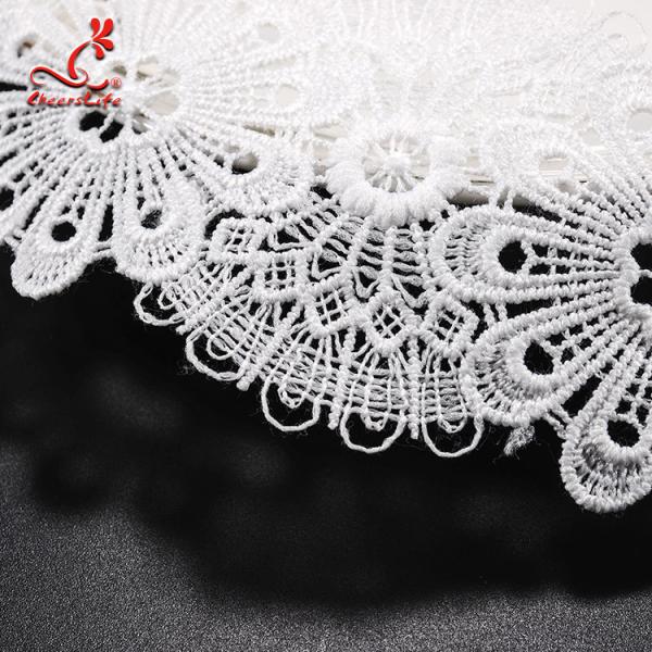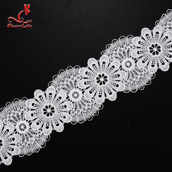 Guipure lace trims were sewing on water-soluble fabric, by dissolving parts of base fabric away in high-temperature water, embroidered patterns remain, also called water soluble lace, and it is suitable for women dresses, skirt, home textile, curtain, bedding articles, apparel, handicraft, blouse, etc.