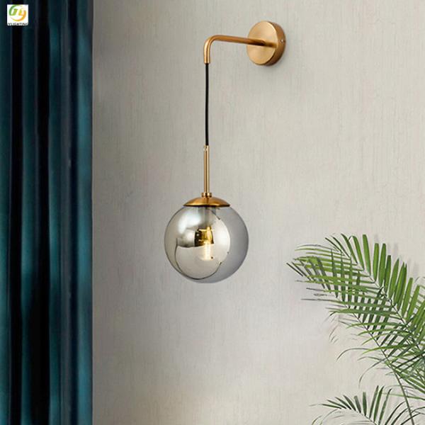 This light with unique and steady golden body made from glass globe. Gorgeous wall light showcases a stunning minimal design in warm brass and the clear round shade makes a statement with its sleek curves. The transparent round glass lampshade and the minimalist line-shaped metal arm show comfortable and relax atmosphere. The round lampshade balances the toughness of the space and makes your room more warm and comfortable.