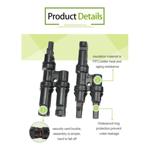 1000V DC rated voltage, 30A rated current and IP67 water proof level perform well in PV system installation programs.Solar Branch Connectors are used for parallel connection between solar panels(PV modules). And it will maintain the voltage of your panel configuration to match your battery size. Sold as a pair. The connectors are only compatible with Solar connectors and it comes with one male (MMF) and one female (FFM) connection.