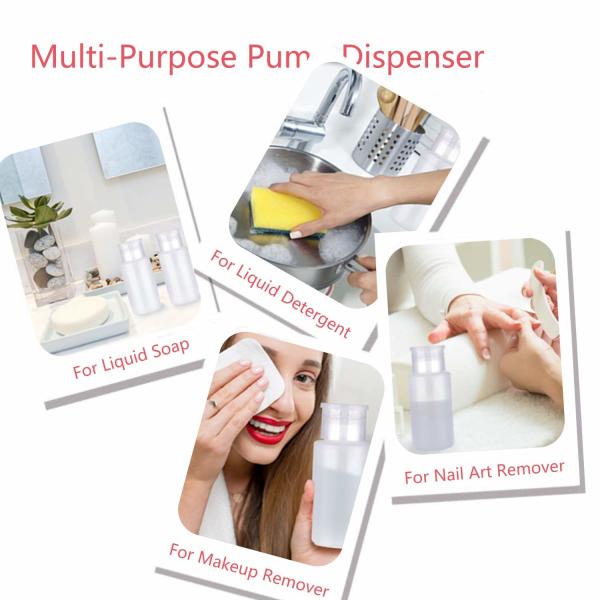 Used For:he Push Dispenser Bottle is the ideal container and essential tool for makeup and nail art; can be applied to makeup remover, cosmetic, toiletries, alcohol, toner, nail polish remover etc.