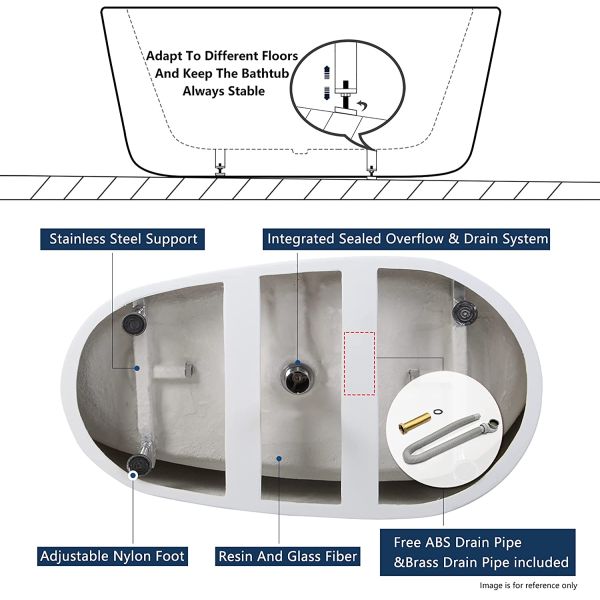 Easy Installation: Illustrated guide with step-by-step instructions makes installation easy. Adjustable leveling feet are included to stabilize the tub to any surface.contact us to order the drain stopper that best suits your bathroom design.