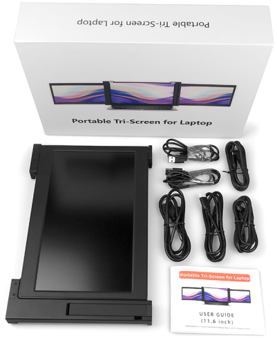 The 10.1 inch tri-screen monitor is mounted on laptops as extended displays. Tri-screen can not only connect to a computer, but also a mobile phone through Type-C to realize the conversion of mobile phone mode/computer mode, so that the mobile phone can become a computer in a few seconds. After connection, the content displayed by the mobile phone can be projected on the screen, or the mobile phone can be used as a microcomputer to operate on the screen like a computer. Currently, this function supports Huawei EMUI and Samsung DEX.