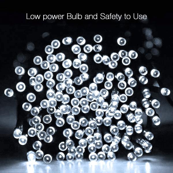White solar string lights: Solar flash string lights are equipped with 200 LED bulbs, total length 22 meters/72 feet, light length: 20 meters/66 feet, wire length: 2 meters/6 feet, space between LEDs: 10 cm/ 4 inches. Environmentally friendly solar power generation at home. The soft lighting is very suitable for decorating gardens, courtyards, lawns, fences, roofs, Christmas, holidays, and weddings. Create a warm, romantic, and happy atmosphere for you, the visual effects are really impressive
